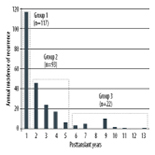 The 232 LT recipients experiencing subsequent HCC recurrence were categorized as Group 1, early recurrence (within 1 year of LT; n=117); Group 2, late recurrence (occurring in years 2–5; n=93); and Group 3, very late recurrence (after year 5; n=22).